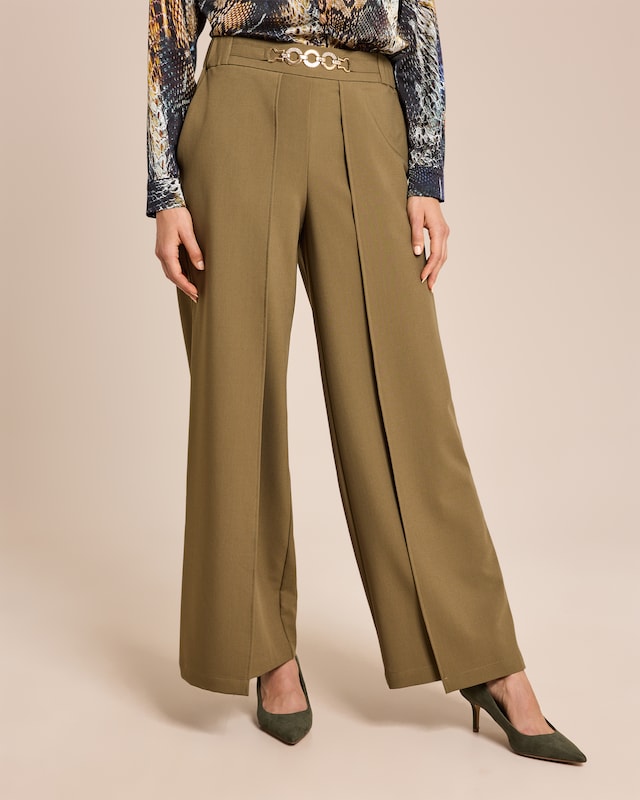 Lassen Sie sich von dieser modischen Hose verzaubern. Das weite, gerade Bein umschmeichelt Ihre Figur und sorgt für ein angenehmes Tragegefühl. Der Teildehnbund mit elegantem Dekoelement verleiht der Hose eine besondere Note. Praktische Eingriffstaschen runden das Design ab. Mit einer Innenbeinlänge von ca. 76 cm in Größe 38 passt sie perfekt zu flachen Schuhen oder Absätzen. Die pflegeleichte Materialmischung macht sie zum idealen Begleiter für Ihren Alltag. Ob im Büro oder bei festlichen Anlässen - diese Hose ist Ihr stilsicherer Partner für jeden Look.