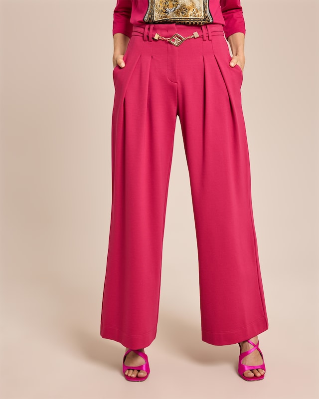 Lassen Sie sich von der Leichtigkeit dieser Hose verzaubern. Der weite Schnitt umschmeichelt Ihre Figur und schenkt Ihnen Bewegungsfreiheit für den ganzen Tag. Die dekorative Verzierung am Bund setzt einen edlen Akzent, während die Kellerfalten im Vorderteil für eine feminine Silhouette sorgen. Mit Eingriffstaschen und geradem Beinverlauf vereint diese Hose Funktionalität und Stil. Das pflegeleichte Material macht sie zum idealen Begleiter für Ihren Alltag. Ob im Büro oder beim Einkaufsbummel - diese Hose ist Ihr neuer Liebling für jede Gelegenheit.