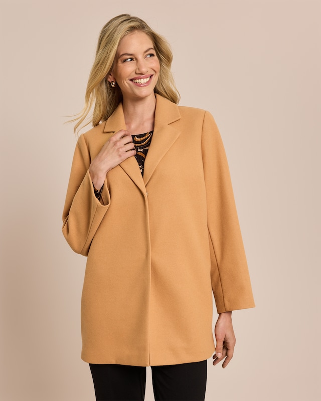 Dieser Übergangsmantel verzaubert mit seiner Wolloptik und verleiht Ihrem Auftritt eine besondere Note. Der Reverskragen und die Druckknöpfe setzen stilvolle Akzente, während die langärmlige Silhouette eine angenehme Wärme spendet. Mit einer Rückenlänge von ca. 82 cm in Größe 38 umschmeichelt er gekonnt Ihre Figur. Das pflegeleichte Material lässt sich mühelos bei 30°C in der Maschine waschen. Von Büro bis Wochenendausflug - dieser Mantel ist Ihr treuer Begleiter durch alle Lebenslagen.
