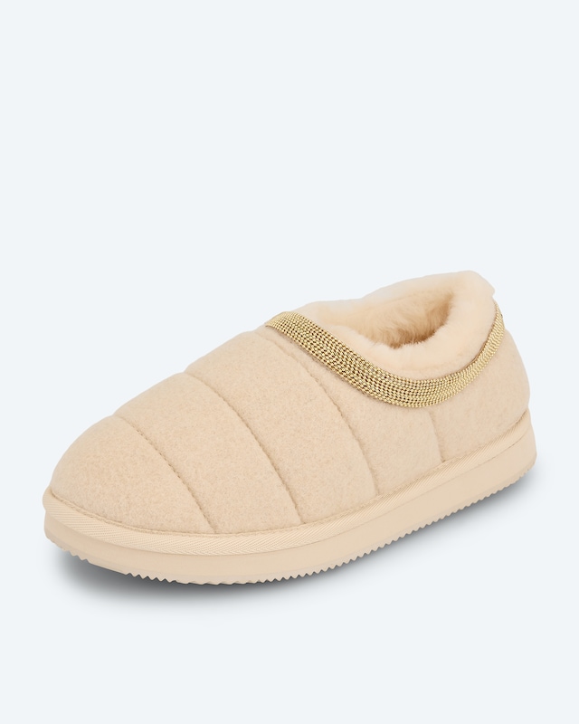Verwöhnen Sie Ihre Füße mit purer Behaglichkeit. Der Hausschuh umschmeichelt Ihre Füße mit weichem Textil und kuscheligem Lammfellfutter. Die gerippte Laufsohle sorgt für sicheren Stand auf allen Untergründen. Dank der komfortablen Weite G gleiten Sie mühelos hinein und genießen grenzenlose Bewegungsfreiheit. Die goldene Zierborte verleiht dem Schuh eine edle Note. Ob morgens beim Frühstück oder abends auf der Couch - dieser Hausschuh wird zu Ihrem treuen Begleiter für entspannte Momente zuhause.
