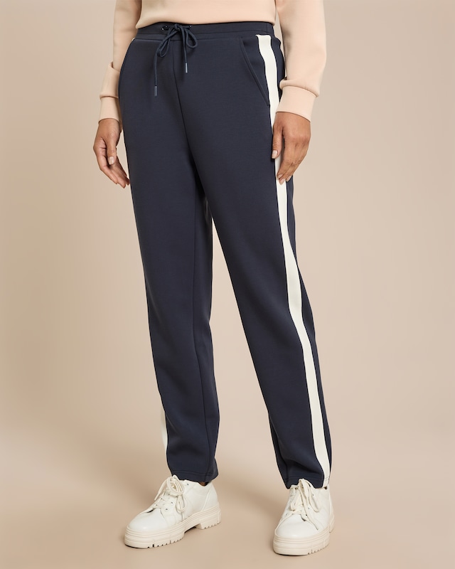 Verwöhnen Sie sich mit purer Behaglichkeit. Diese Sweathose mit Galon vereint Stil und Gemütlichkeit mühelos. Der elastische Bund mit Kordelzug passt sich Ihrer Figur perfekt an, während die seitlichen Eingrifftaschen praktischen Komfort bieten. Der Kontraststreifen an der Seitennaht setzt einen modischen Akzent. Das gerade geschnittene Bein in Knöchellänge schmeichelt Ihrer Silhouette. Aus weichem, leicht elastischem Material gefertigt, wird diese Hose zu Ihrem unverzichtbaren Begleiter für entspannte Tage zuhause oder legere Ausflüge. Genießen Sie die perfekte Balance aus Lässigkeit und Eleganz.