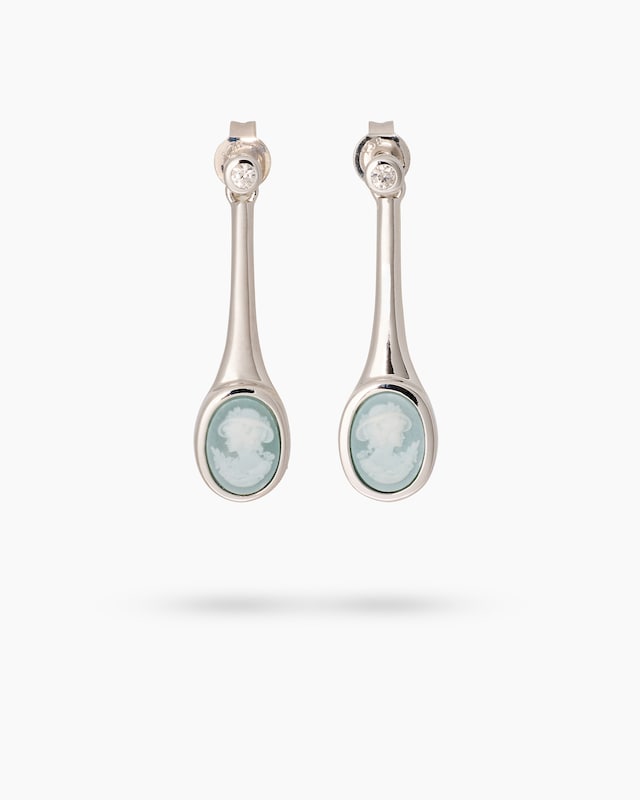 Tauchen Sie ein in die Welt zeitloser Schönheit mit diesen atemberaubenden Ohrhängern. Das hochglanzpolierte, rhodinierte 925er Sterlingsilber betont perfekt das elegante, längliche Pendel-Design. 2 zartblaue, ovale Aventurin-Kameen von je ca. 8 x 6 mm mit feiner Gravur werden von je einem funkelnden weißen Zirkon ergänzt – alle Steine sitzen sicher in Zargenfassungen. Mit insgesamt 3,18 ct sind diese Ohrhänger Ihr idealer Begleiter für einen stilvollen Abend oder als besonderes Highlight im Büro. Kombinieren Sie sie mit einem schlichten schwarzen Kleid oder einer eleganten Bluse.