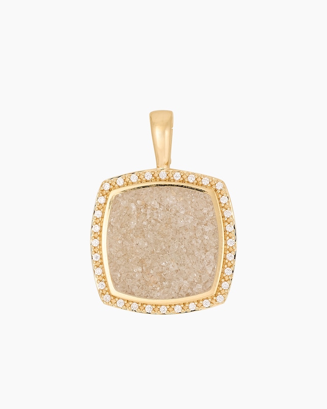 In Zentrum des Sogni d'oro Facettenreich Anhängers glänzt ein quadratischer Diamantkristall in irisierender Optik. Der behandelte Edelstein in getöntem Weiß beeindruckt durch seine Größe. Er wird in einer Zargenfassung gehalten und von insgesamt 32 weißen Zirkonen in Krappenfassungen eindrucksvoll eingerahmt. Das Schmuck-Accessoire ist aus warmem 375er Gelbgold im Hochglanzfinish gefertigt und lässt sich dank Clip bequem in Ihre Goldketten einhängen. Damit sorgen Sie für Abwechslung bei Ihrem Halsschmuck.