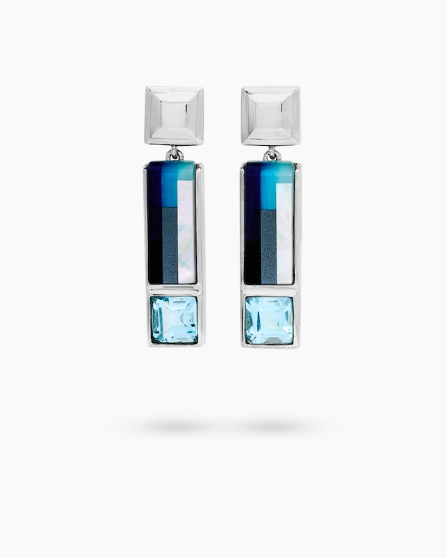 Stilvolle Eyecatcher mit dem gewissen Etwas: Auf diesen Ohrschmuck wird man Sie garantiert ansprechen. Die großen Hänger-Elemente sind mit je einem Blautopas in Carréform sowie einem Mosaik-Edelstein in rechteckiger Form ausgefasst. Das raffinierte, multifarbene Mosaik besteht aus Katzenauge, Onyx, Hämatit und Perlmutt. Für eine optimale Performance an Ihrer Halspartie ist der Blautopas facettiert, während das Mosaik glatt poliert wurde.