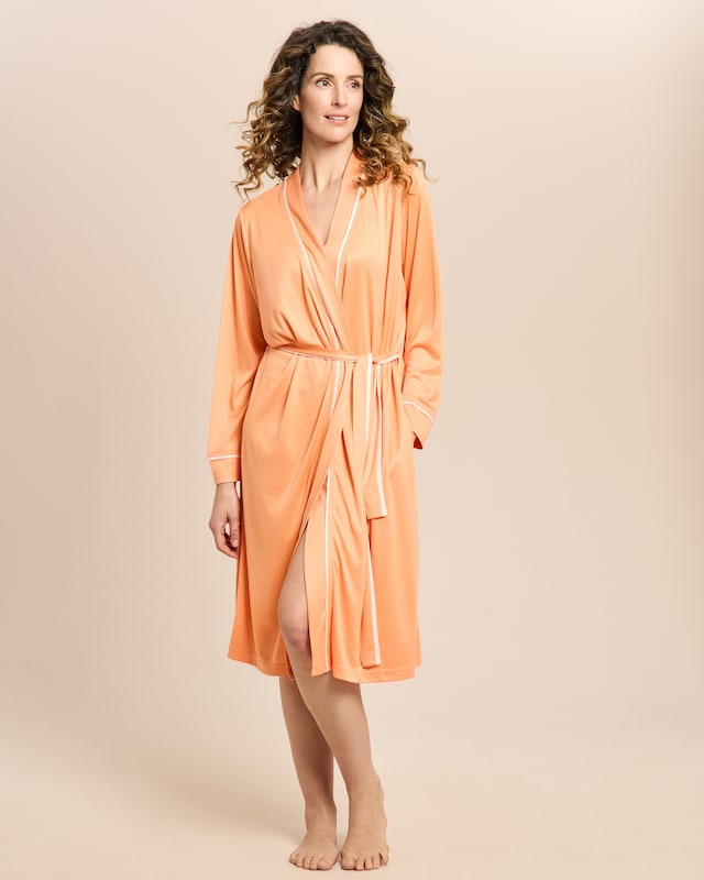 Diesen kuschelweichen Bademantel werden Sie am liebsten Tag und Nacht tragen wollen. Doch das tolle Wohlfühl-Modell ist nicht nur superbequem, sondern auch ausgesprochen attraktiv. Bademantel und Bindegürtel sind komplett im Unidesign gehalten, dabei stehen drei intensive Farben zur Wahl. Jeweils mit abgestimmtem Piping für eine elegante Optik. Das schicke Teilchen muss unbedingt mit, wenn Sie sich mal wieder irgendwo eine Runde Wellness gönnen. Tipp: Passendes Nightshirt-Duo gleich mitbestellen (481685).