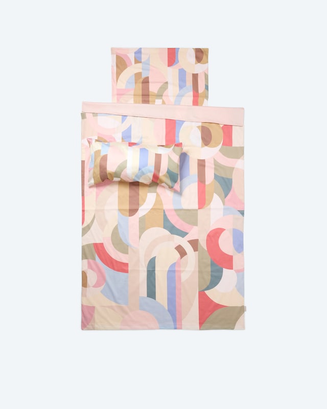 Die dreiteilige Wendebettwäsche besteht aus zwei Kopfkissenbezügen in zwei verschiedenen Größen und einem Bettdeckenbezug - natürlich mit praktischen Reißverschlüssen. Freuen Sie sich auf die herrliche Baumwoll-Satin-Qualität, die mit feinem Glanz und weichem Griff begeistert. Die Vorderseiten sind bunt im verspielten Grafikdesign gearbeitet, die Rückseiten sind unifarben. Der Name Stampi bedeutet auf italienisch Formen und steht für die Formen im Pop-Up-Art angelehnten Design. Das atmungsaktive, hautsympathische Material ist mit dem Öko-Tex-Label zertifiziert und hygienisch bei 60° waschbar.