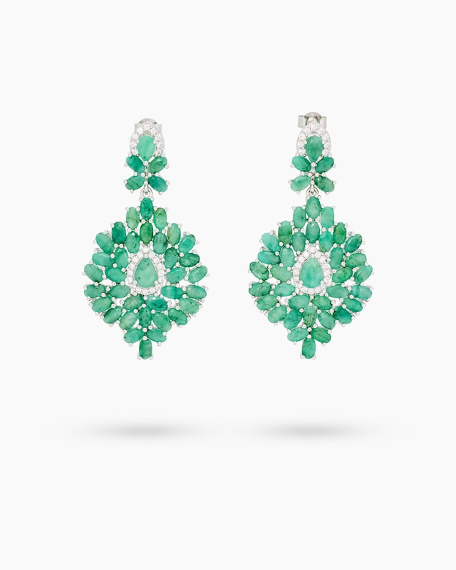 Lassen Sie sich von der zeitlosen Eleganz dieser exquisiten Ohrstecker verzaubern. Die faszinierenden Schmuckstücke vereinen die intensive Farbpracht von Smaragden mit dem funkelnden Glanz von Zirkonen und kreieren so ein wahres Meisterwerk der Juwelierskunst. Im Zentrum jedes Ohrsteckers thront ein tropfenförmiger Smaragd, umgeben von einer Vielzahl kleinerer ovaler und tropfenförmiger Smaragde, die in einer kunstvollen Anordnung gefasst sind. Die leuchtend grünen Edelsteine, allesamt aus Brasilien stammend, werden durch präzise gesetzte weiße Zirkonia-Steine elegant akzentuiert. Jeder Stein ist sorgfältig in einer Krappenfassung aus hochglanzpoliertem 925er Sterlingsilber eingebettet, was ihre natürliche Schönheit optimal zur Geltung bringt. Mit einer Gesamtlänge von ca. 4,67 cm und einer Breite von ca. 2,46 cm sind diese Ohrstecker ein beeindruckender Blickfang. Der sichere Schmetterlingsverschluss sorgt für bequemen Tragekomfort. Diese Ohrstecker von Harry Ivens sind nicht nur ein Schmuckstück, sondern ein Statement – perfekt für besondere Anlässe oder als luxuriöse Ergänzung Ihres täglichen Looks.