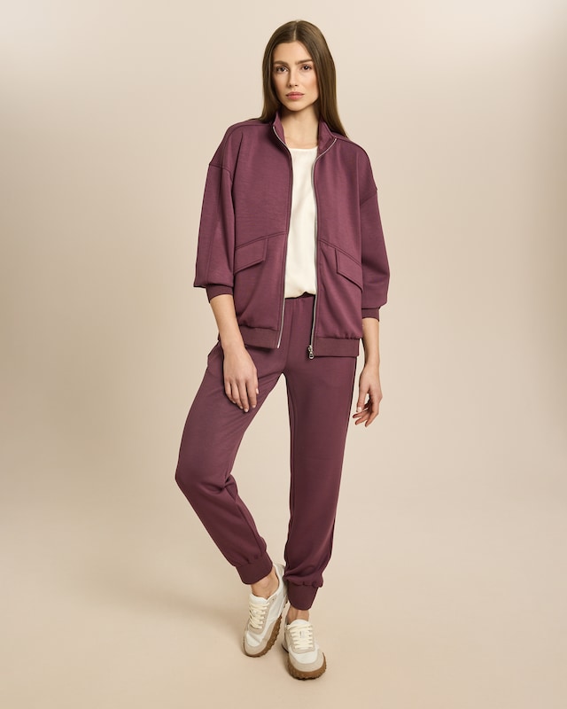 Dieses zweiteilige Set vereint Lässigkeit mit durchdachten Details für Ihren entspannten Alltag. Die Jacke mit Stehkragen und durchgehendem Reißverschluss zeigt sich mit praktischen Pattentaschen und langen Ärmeln, die in elastischen Bündchen enden. Der leicht oversized geschnittene Schnitt schmeichelt Ihrer Figur. Die dazu passende Hose sitzt dank des breiten, elastischen Bundes angenehm auf der Hüfte und bietet mit den seitlichen Eingriffstaschen zusätzlichen Nutzen. Beide Teile lassen sich mühelos kombinieren und begleiten Sie stilvoll durch entspannte Stunden zu Hause oder bei Besorgungen. Ein Set, das Ihnen Freiraum schenkt.