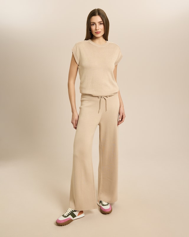 Ihr neues Lieblingsoutfit wartet bereits auf Sie und verwandelt jeden Tag in einen besonderen Moment. Dieses zweiteilige Strickset besteht aus einem lässigen Oberteil mit kurzen Ärmeln und einer bequemen Hose mit weitem Schnitt. Das besondere Highlight sind die raffinierten Knopfapplikationen an den Schultern, die dem schlichten Rundhalsausschnitt eine verspielte Note verleihen. Die Hose überzeugt mit ihrem entspannten Bindegürtel in der Taille und dem fließenden, geraden Beinverlauf. Kombinieren Sie beide Teile als harmonisches Ensemble oder tragen Sie sie einzeln zu Ihren Lieblingsstücken – dieses Set passt sich mühelos Ihrem Alltag an und begleitet Sie von entspannten Stunden zu Hause bis zu stilvollen Ausflügen.