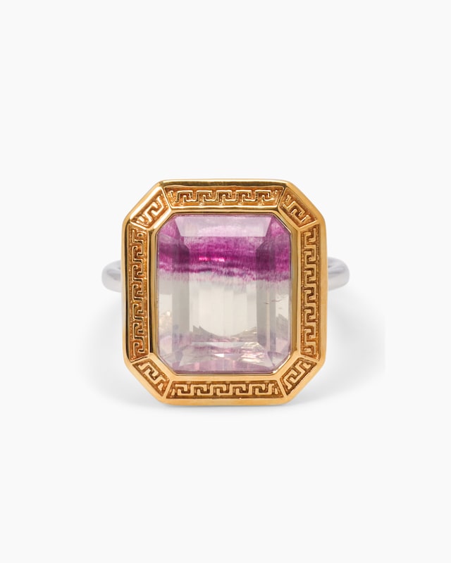 Ein Schmuckstück, das die Schönheit der Natur in ihrer ganzen Pracht einfängt und Ihren Look mit einem Hauch von Exklusivität bereichert. Dieser Ring von Sogni d'oro präsentiert einen natürlichen Fluorit aus Brasilien mit einem beeindruckenden Gesamtgewicht von ca. 6,00 ct. Der facettierte Edelstein in achteckiger Form besticht durch sein mehrfarbiges Farbspiel, das von zarten Violett- und Rosatönen bis hin zu transparenten Nuancen reicht – ein faszinierendes Naturschauspiel, das jeden Blick auf sich zieht. Der Fluorit ist in einer Zargenfassung sicher eingefasst und wird von einem kunstvoll gestalteten, teilvergoldeten Rahmen mit antikem Mäandermuster umgeben, der dem Design eine zeitlose Eleganz verleiht. Die hochglanzpolierte Ringschiene aus rhodiniertem Sterlingsilber 925 sorgt für einen edlen Kontrast und angenehmen Tragekomfort. Mit einem Ringkopf von ca. 17,6 x 15,9 mm setzt dieser Ring ein eindrucksvolles Statement an Ihrer Hand. Was die Qualität unserer Schmuckstücke angeht, gehen wir keine Kompromisse ein. Aus diesem Grund werden unsere Schmuckwaren von unserer Qualitätssicherung und seitens des Lieferanten strengsten Prüfprozessen unterzogen. Unter anderem beinhalten unsere Prüfprozesse Prüfungen auf Konformität mit den Bestimmungen der Schweizer Edelmetallkontrollgesetzgebung. Ein außergewöhnliches Schmuckstück, das natürliche Schönheit und edles Handwerk perfekt vereint.