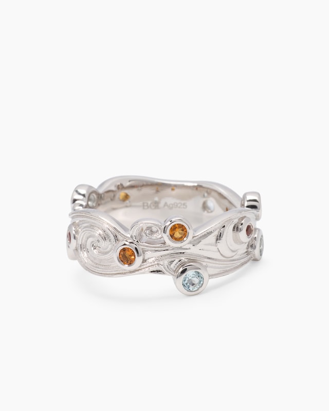 Wie ein Sternenhimmel funkeln die kostbaren Edelsteine dieses Rings und verleihen Ihrem Look eine bezaubernde Note. Dieser Ring aus der Linie Silbermaster besticht durch sein verspieltes Design mit fließenden Ornamenten, die an sanfte Wellen erinnern. In rhodiniertem Sterlingsilber 925 gefasst, vereint das Schmuckstück 12 facettierte Edelsteine in harmonischer Komposition: 5 Sky Blue Topase, 5 Citrine und 2 Granate mit einem Gesamtgewicht von ca. 0,56 ct. Die natürlichen Edelsteine sind in eleganten Zargenfassungen eingebettet und setzen farbenfrohe Akzente. Die strukturierte Oberfläche der Ringschiene wechselt sich mit hochglanzpolierten Partien ab und unterstreicht die kunstvolle Handwerkskunst. Mit einer Schienenbreite von ca. 5,0-8,9 mm liegt der Ring angenehm am Finger und bietet höchsten Tragekomfort. Was die Qualität unserer Schmuckstücke angeht, gehen wir keine Kompromisse ein. Aus diesem Grund werden unsere Schmuckwaren von unserer Qualitätssicherung und seitens des Lieferanten strengsten Prüfprozessen unterzogen. Unter anderem beinhalten unsere Prüfprozesse Prüfungen auf Konformität mit den Bestimmungen der Schweizer Edelmetallkontrollgesetzgebung. Ein Schmuckstück, das Ihre Persönlichkeit auf einzigartige Weise zum Ausdruck bringt und Sie jeden Tag aufs Neue begeistern wird.