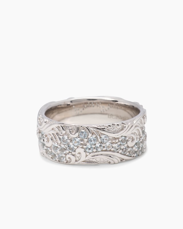 Ein Ring, der mit seinem verspielten Design und dem zarten Schimmer edler Blautopase verzaubert – ein Schmuckstück, das Ihre Persönlichkeit auf besondere Weise unterstreicht. Dieser Ring aus der Linie Silbermaster von Sogni d'oro besteht aus rhodiniertem Sterlingsilber 925 und ist mit 33 facettierten Blautopas-Edelsteinen besetzt, die in Krappenfassungen sicher gehalten werden. Die runden Blautopase in Sky Blue haben ein Gesamtgewicht von ca. 0,53 ct und stammen aus Brasilien. Durch den Facettenschliff entfalten die Edelsteine bei jedem Lichteinfall ein wunderschönes Funkeln. Die Ringschiene ist ca. 7,9-8 mm breit und zeigt ein filigranes, strukturiertes Ornamentmuster, das dem Schmuckstück eine romantische Note verleiht. Die Kombination aus hochglanzpolierten und strukturierten Flächen sorgt für einen reizvollen Kontrast. Ein elegantes Accessoire, das sowohl im Alltag als auch zu besonderen Anlässen eine stilvolle Wahl ist. Was die Qualität unserer Schmuckstücke angeht, gehen wir keine Kompromisse ein. Aus diesem Grund werden unsere Schmuckwaren von unserer Qualitätssicherung und seitens des Lieferanten strengsten Prüfprozessen unterzogen. Unter anderem beinhalten unsere Prüfprozesse Prüfungen auf Konformität mit den Bestimmungen der Schweizer Edelmetallkontrollgesetzgebung.
