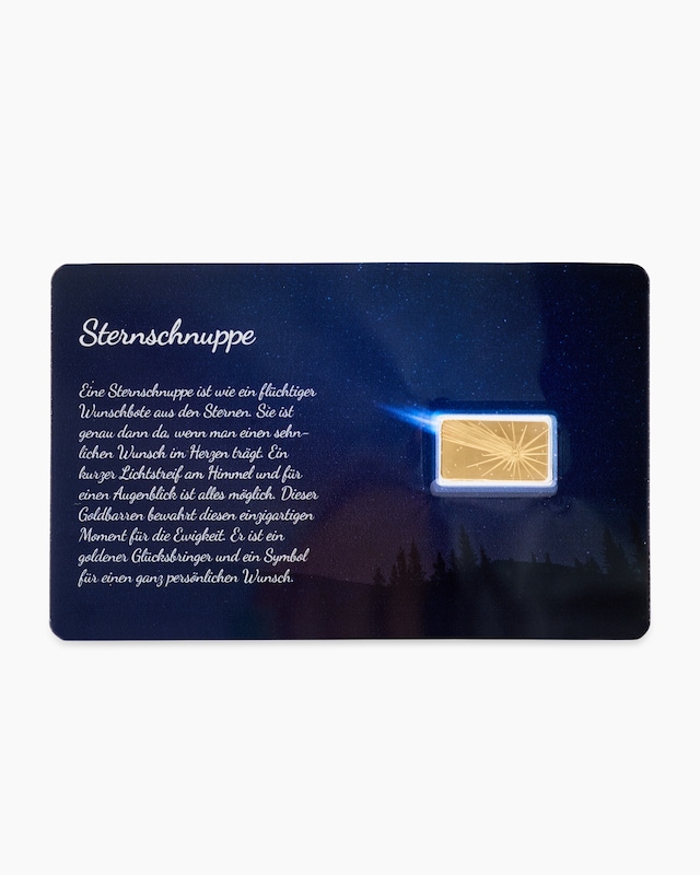 Halten Sie einen Moment voller Magie fest – mit diesem außergewöhnlichen Goldmünzbarren, der die zeitlose Symbolkraft einer Sternschnuppe in reinstem Gold verewigt. Wenn eine Sternschnuppe über den Nachthimmel zieht, erfüllt sie uns mit Hoffnung und dem Wunsch nach Glück. Genau dieses besondere Gefühl fängt dieser randlos geprägte Goldmünzbarren ein und macht ihn zu einem perfekten Geschenk für sich selbst oder geliebte Menschen. Der Münzbarren besteht aus 1/100 Oz reinem .9999 Gold und wurde in der höchsten Prägequalität "Polierte Platte" gefertigt. Auf dem Avers zeigt sich die stilisierte Sternschnuppe in edlem Glanz – ein Sinnbild für Träume, Wünsche und Herzensmomente. Die Wertseite präsentiert das Nominal von 100 Francs sowie das Staatswappen und macht den Goldbarren zu einem gesetzlichen Zahlungsmittel der Demokratischen Republik Kongo. Eine Besonderheit ist die thematisch abgestimmte Münzkarte: Sie greift das Motiv eindrucksvoll auf – mit einem funkelnden Sternenhimmel und der Spur einer Sternschnuppe, die sich visuell über den Münzbarren und das Kartendesign hinweg fortsetzt. So entsteht ein emotionales Gesamtbild, das Herz und Auge gleichermaßen berührt. Die hochwertige Coincard schützt das Sammlerstück und dient gleichzeitig als offizielles Echtheitszertifikat mit allen wichtigen Angaben zu Feingehalt, Prägequalität, Limitierung und Status als gesetzliches Zahlungsmittel. Die strenge Limitierung auf nur 2.026 Exemplare – angelehnt an das Ausgabejahr 2026 – macht diesen Goldmünzbarren zu einem begehrten Sammlerstück. Mit einem Durchmesser von 15,2 mm und einer Länge von 8,6 mm ist er ein handliches Kleinod, das große Emotionen trägt. Ein immer perfektes Geschenk, das Glück und Wertbeständigkeit vereint.